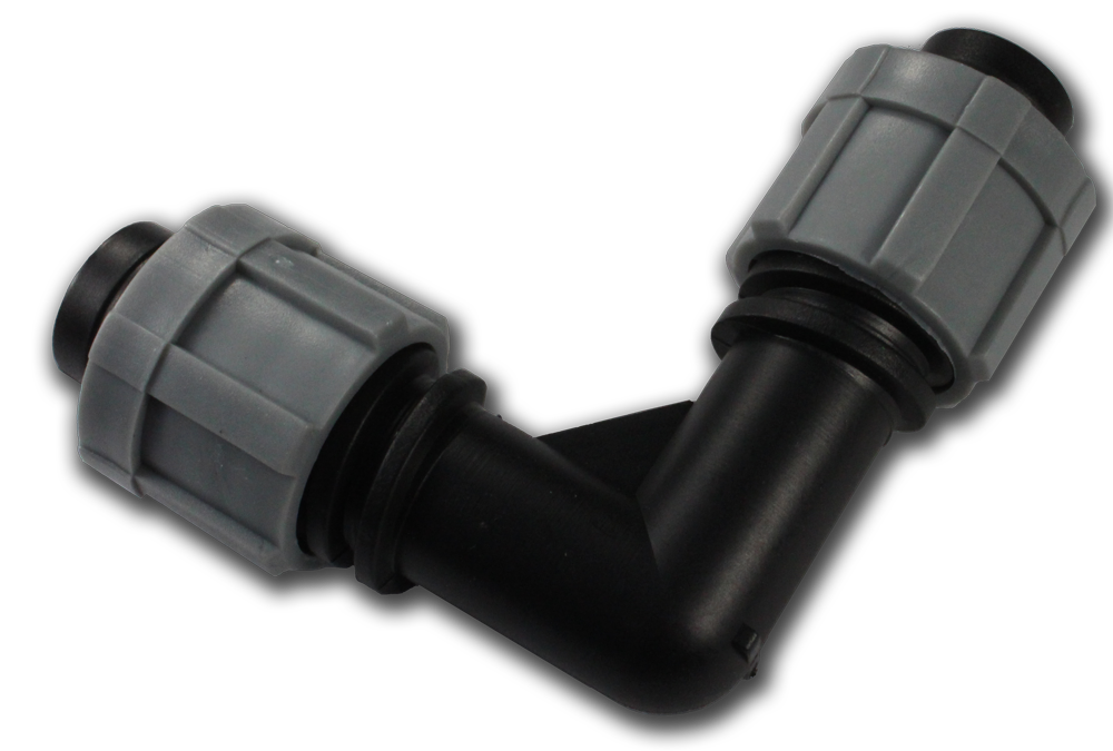 Коліно для з’єднання двох відрізків крапельної стрічки під кутом 90°. Застосовується в системах крапельного зрошення, як на великих полях, так і на невеликих ділянках.